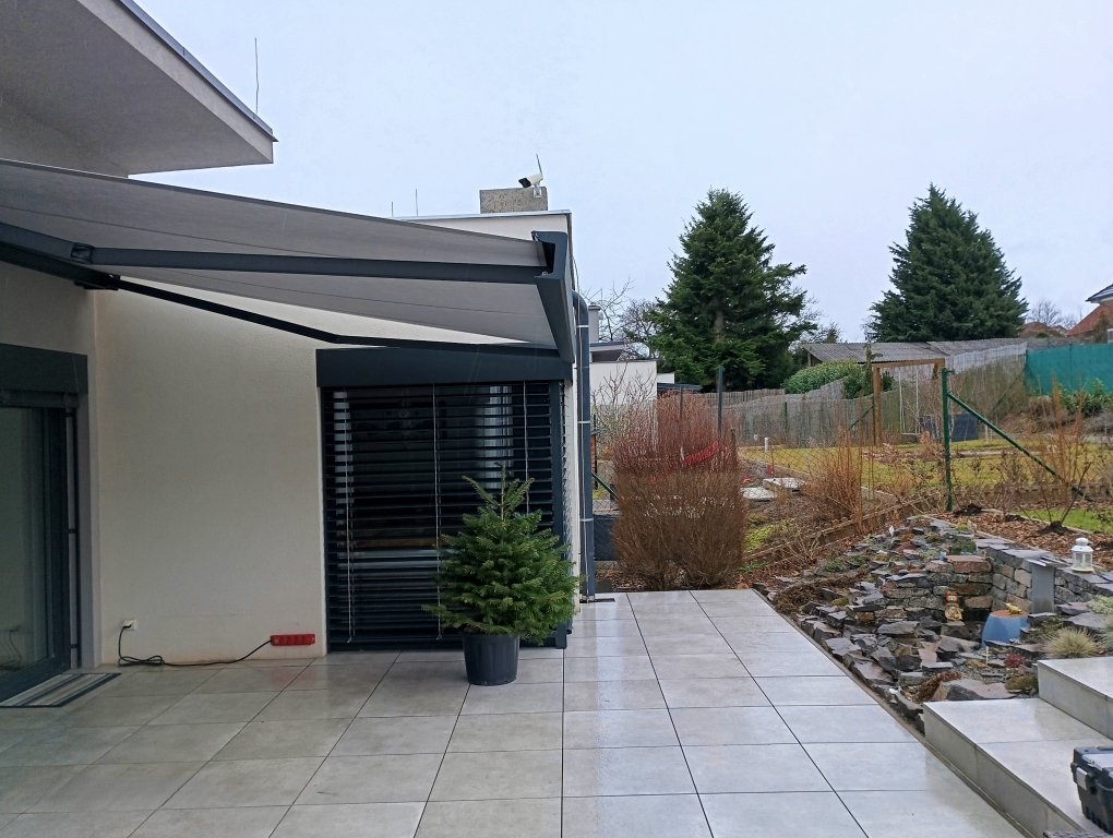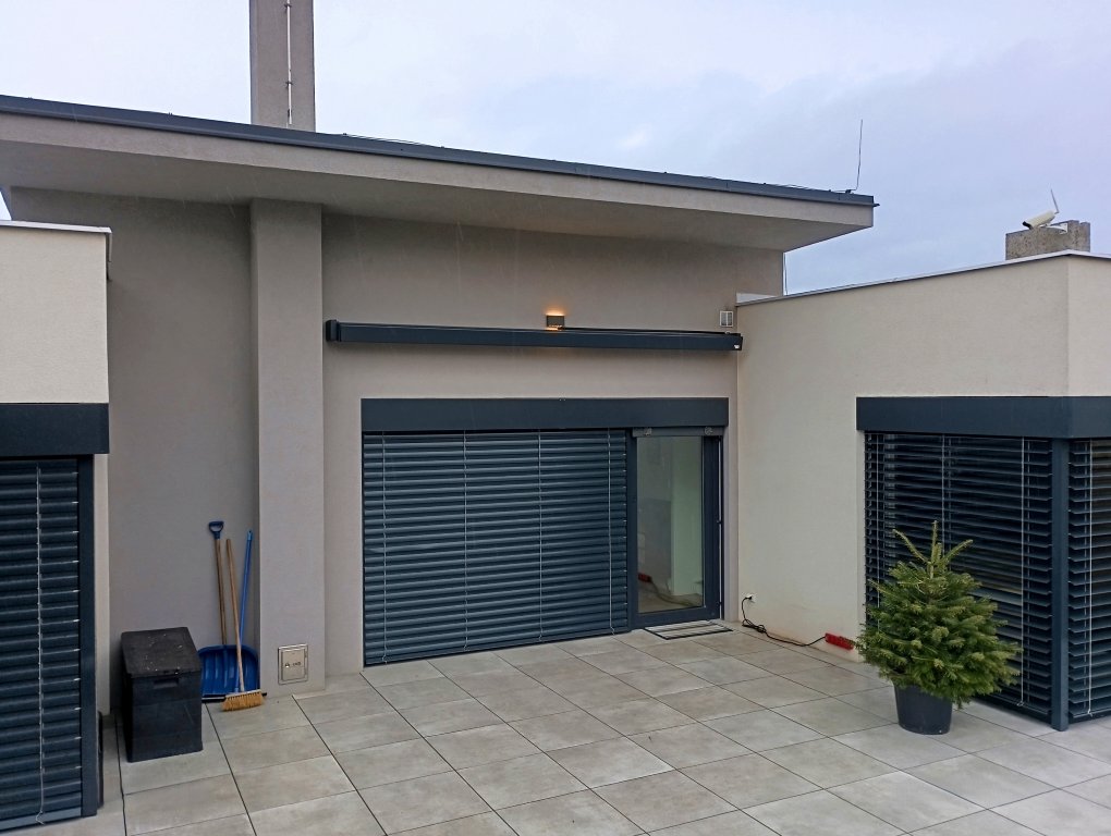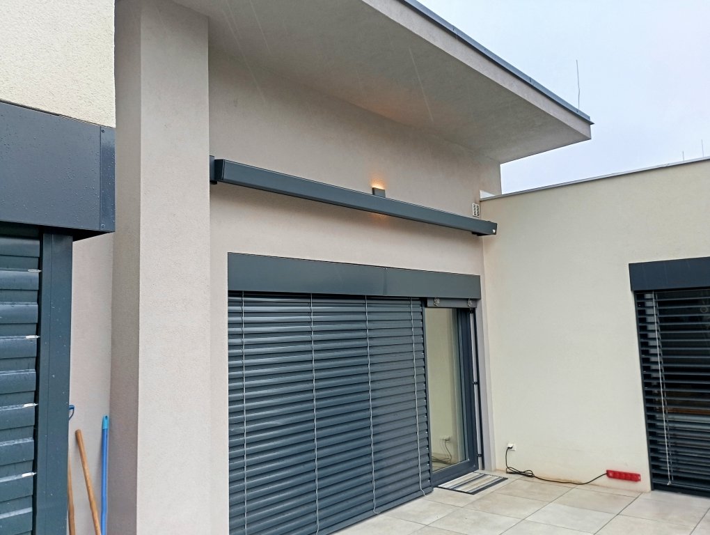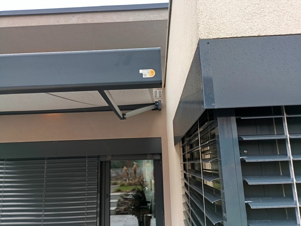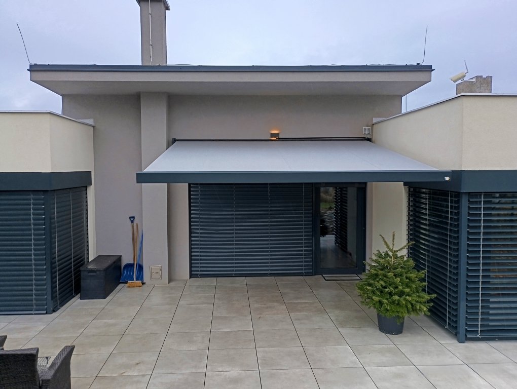 Hledáte stínění, které vydrží roky a skvěle vypadá? Tato realizace kazetové markýzy Alandbox je jasnou odpovědí. V rozměru 4 x 3,5 metru pokrývá značnou část terasy a díky motoru IO Sunea nabízí uživatelům maximální pohodlí. Konstrukce v odstínu RAL 7016 mat ideálně doplňuje moderní fasádu a antracitové rámy oken. Celý systém byl odborně ukotven přes izolační vrstvu domu pomocí šroubovic, což zajišťuje bezpečný provoz i při mírném větru. Látka v neutrální šedé barvě (odstín 314 028) propouští dostatek světla, ale účinně odráží teplo. Právě teď u nás probíhá velká ZIMNÍ AKCE: získejte slevu 10 % na kazetové markýzy Arkobox, Alandbox, Aresbox a Kymabox při objednání do 28. února 2026!