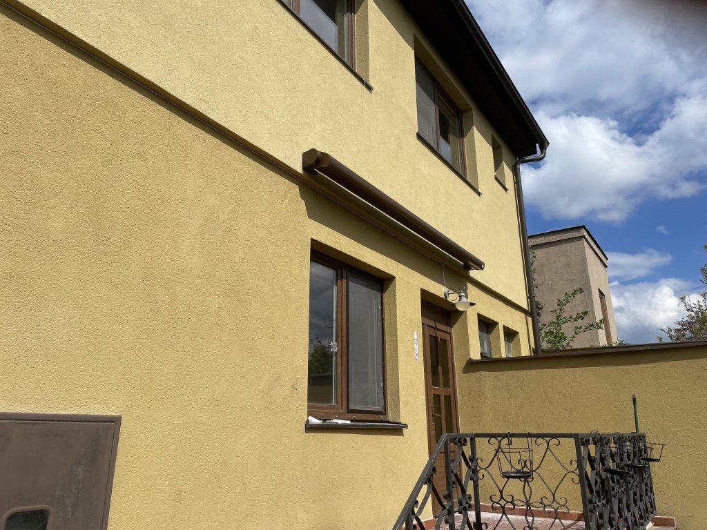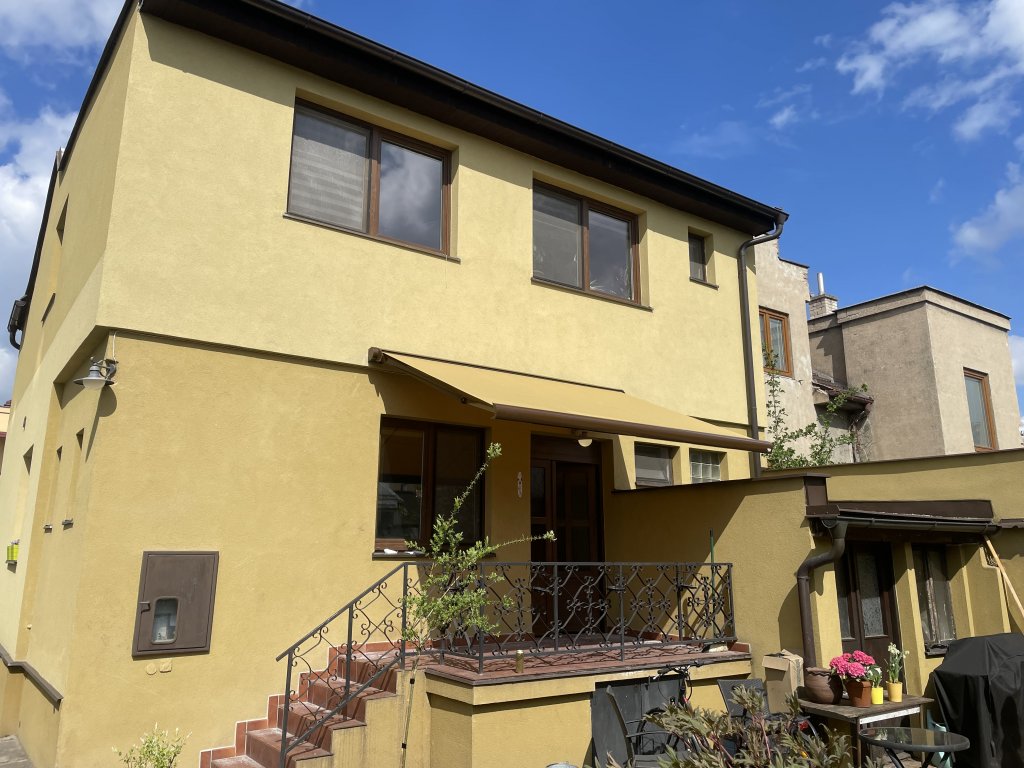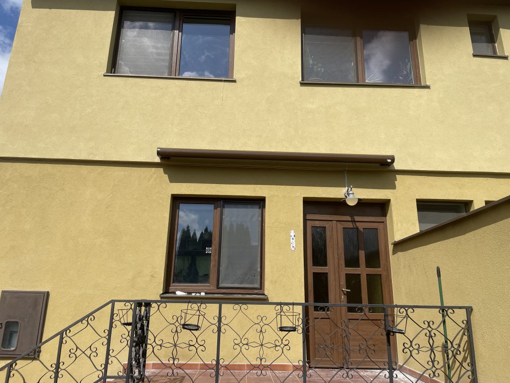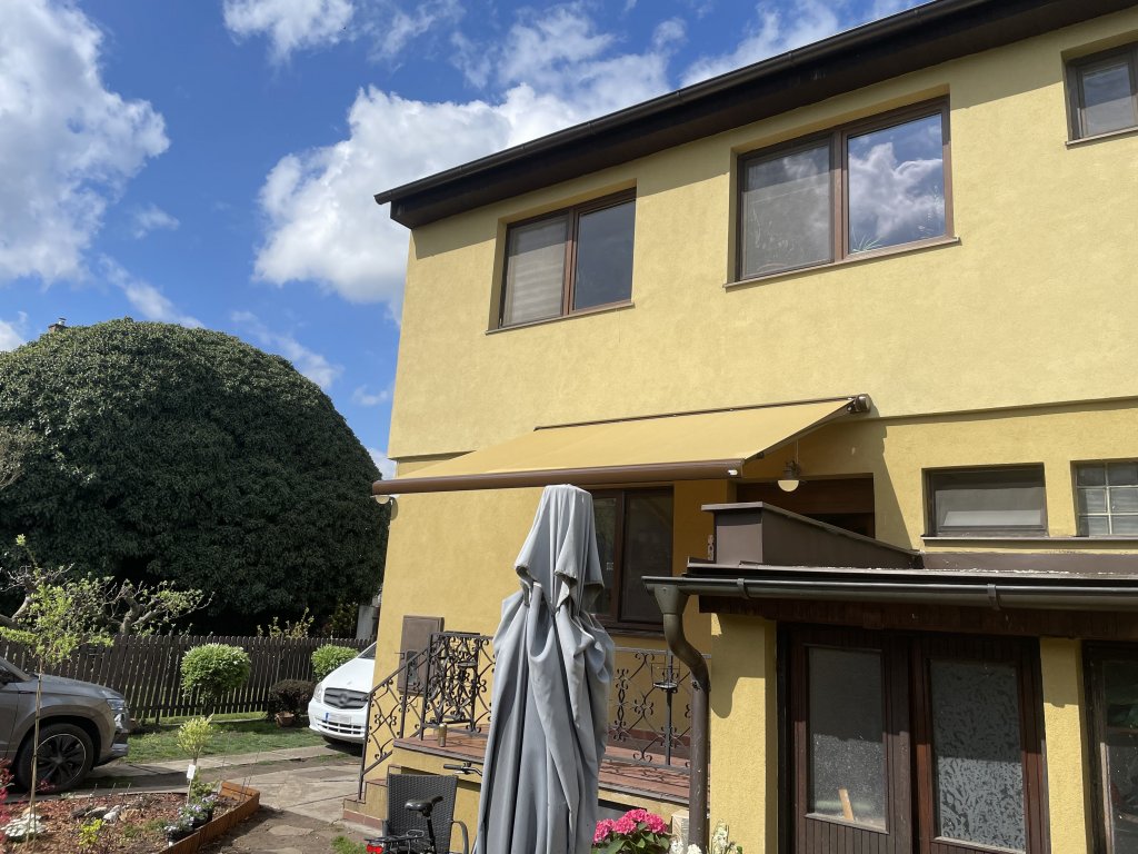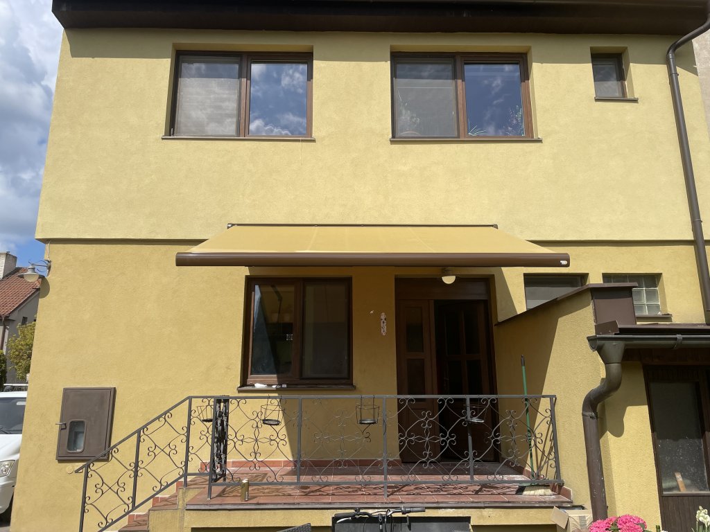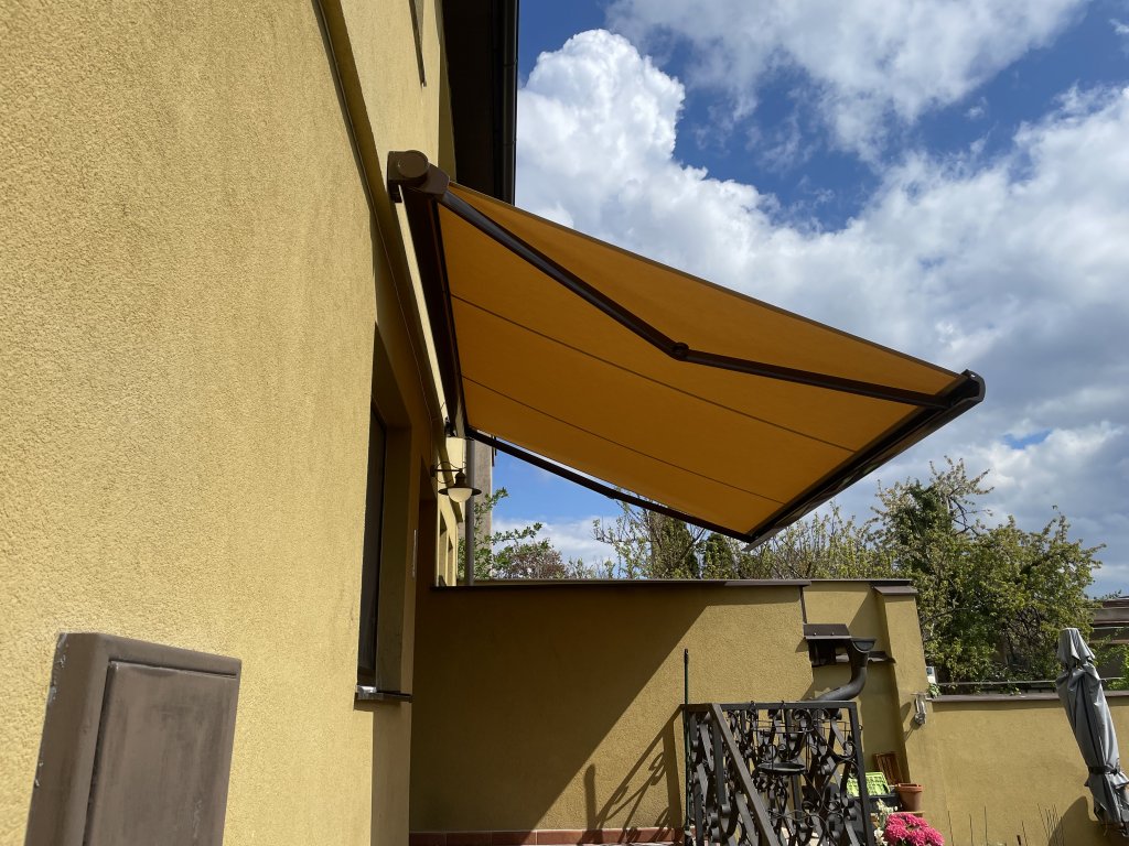 Při této realizaci jsme se zaměřili na detail, který dělá celek dokonalým. Hlavním požadavkem bylo, aby markýza nepůsobila jako cizí prvek, ale jako přirozená součást architektury. Zvolili jsme proto horizontální kazetovou markýzu Aresbox, jejíž potah byl pečlivě vybrán tak, aby přesně odpovídal fasádě objektu. Nejde o klasickou žlutou ani hnědou; zvolený odstín je hřejivý kompromis mezi těmito barvami s jemným zlatavým nádechem. V kombinaci s hnědou lesklou konstrukcí (RAL 8014) tak markýza vytváří elegantní a nerušivý prvek, který majitelům poskytuje komfortní stín a zároveň podtrhuje estetiku jejich domova.