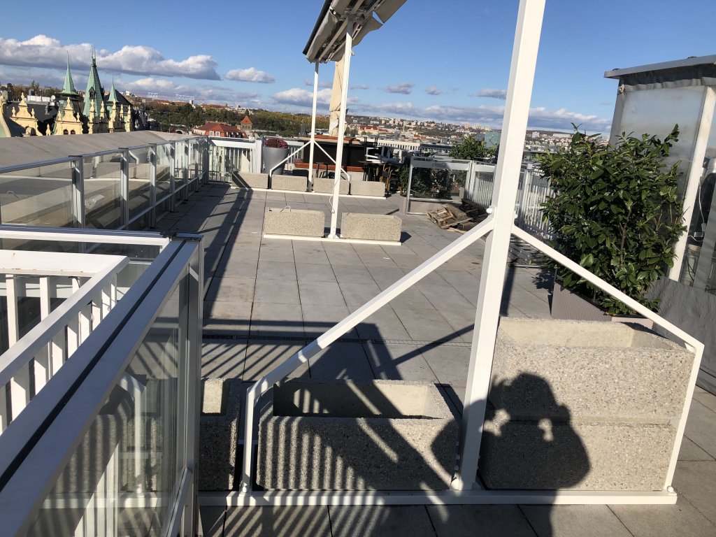 Realizace tohoto markýzového přístřešku na rozlehlé střešní terase byla inženýrskou výzvou, kterou jsme s precizností zvládli. Klient potřeboval zastřešit plochu téměř 71 m² (11,8 x 6,0 m) s maximální spolehlivostí a estetikou. Základem je speciálně navržená ocelová nosná konstrukce, která byla ošetřena bílým komaxitem pro dlouhodobou odolnost a dokonalý vzhled. K zajištění stability ve výšce (s ohledem na silné větrné poryvy) jsme použili elegantní a účinné zatížení v podobě betonových květináčů, které zároveň vizuálně oddělují prostor. Na konstrukci jsou zavěšeny čtyři samostatné výsuvné markýzy v příjemné krémové barvě. Motorické ovládání zajišťuje bezstarostné nastavení stínu jediným stiskem tlačítka, a to i pro takto rozsáhlou plochu. Přidali jsme i speciální boční vzpěry, které zvyšují stabilitu markýz ve větrnějších podmínkách. Tento projekt je ukázkou, že i ve složitých podmínkách dokážeme dodat spolehlivé, estetické a na míru šité řešení.