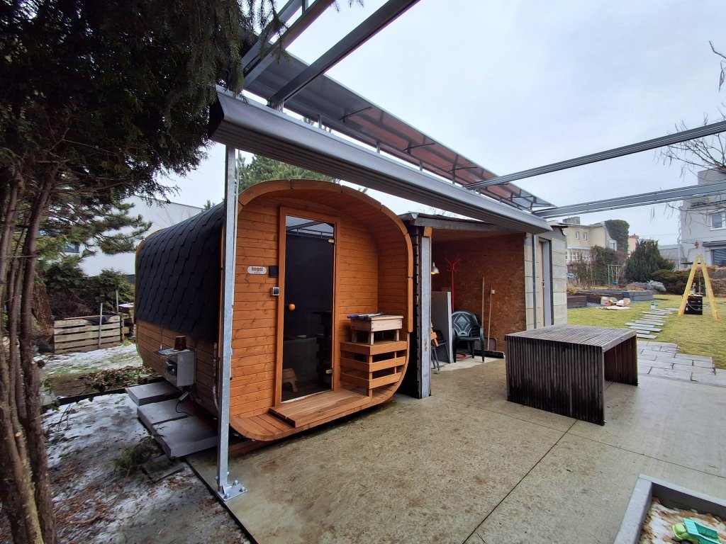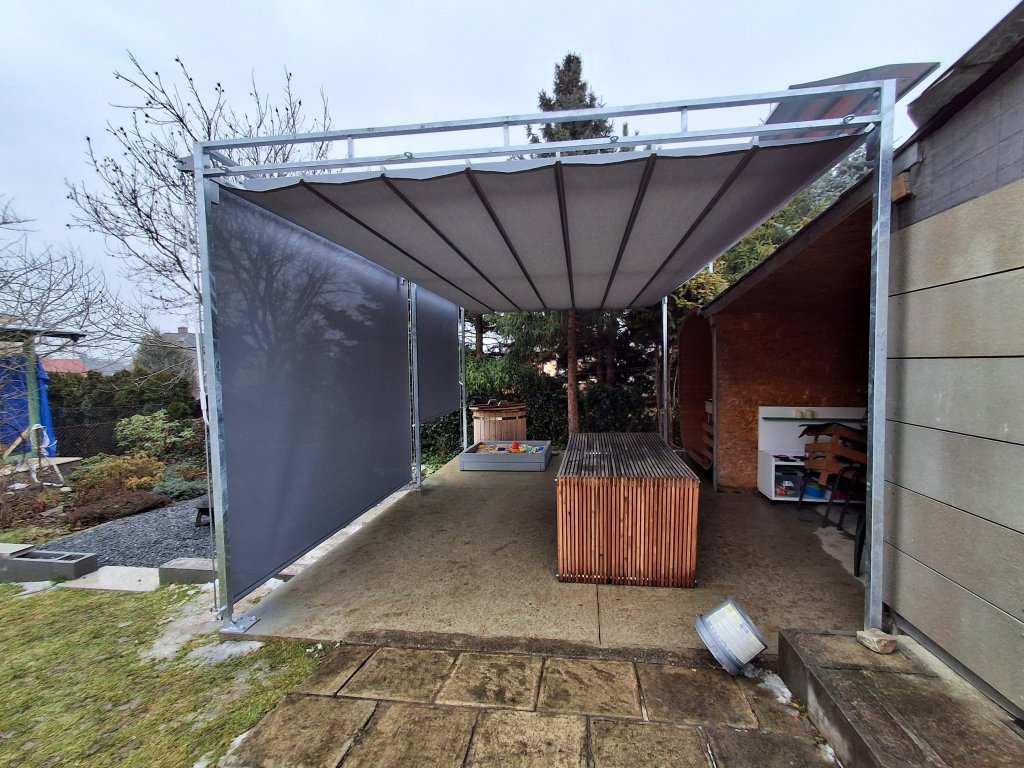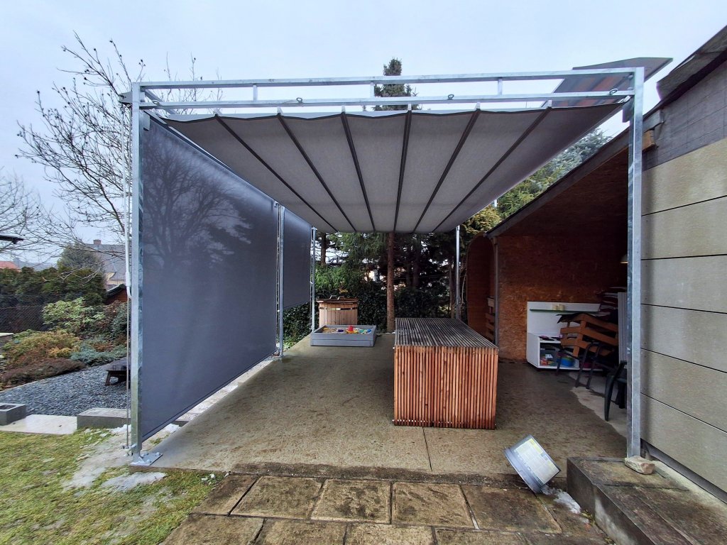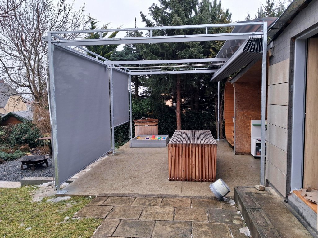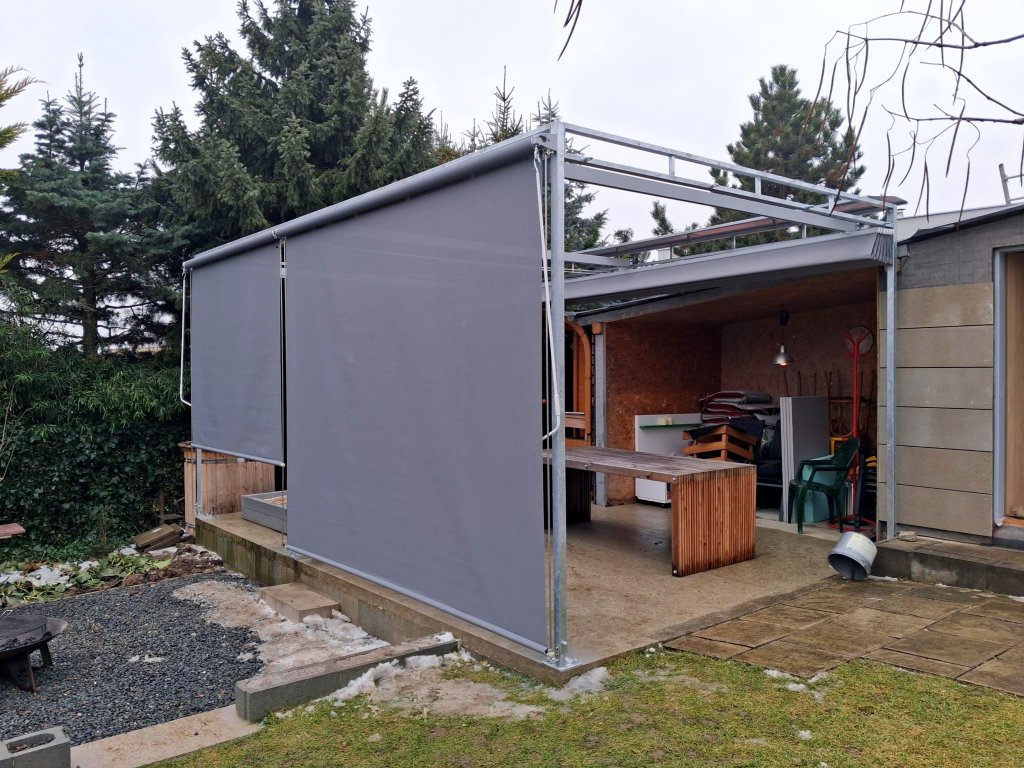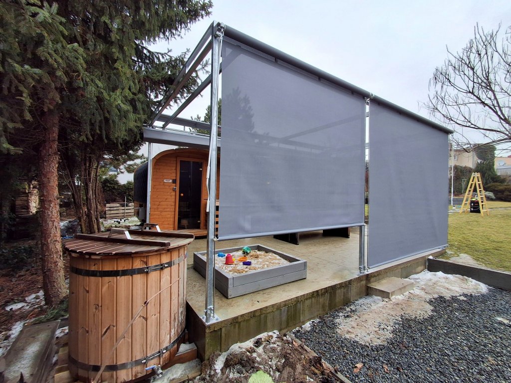 Tato realizace je ukázkou naší schopnosti dodat kompletní řešení od prvního šroubku až po poslední detail stínění. Pro zákazníka jsme nejprve vyrobili a smontovali pomocnou ocelovou konstrukci v pozinku, která vytvořila pevný základ pro následnou instalaci stínicích prvků. Na tuto konstrukci byla osazena podvěsná pergola Latin 80 v šedém provedení, která díky mírně vypnutému potahu a sklonu na levou stranu zajišťuje spolehlivý odvod vody i příjemný stín. Aby byl komfort stoprocentní, doplnili jsme boční stranu svislými clonami Sandra Ext. Ty jsou osazeny technickou tkaninou Serge, která propouští optimální množství světla, ale zároveň chrání před ostrým sluncem a pohledy zvenčí. Celý systém je ovládán mechanicky, což zaručuje dlouhou životnost a nezávislost na elektrické energii.
