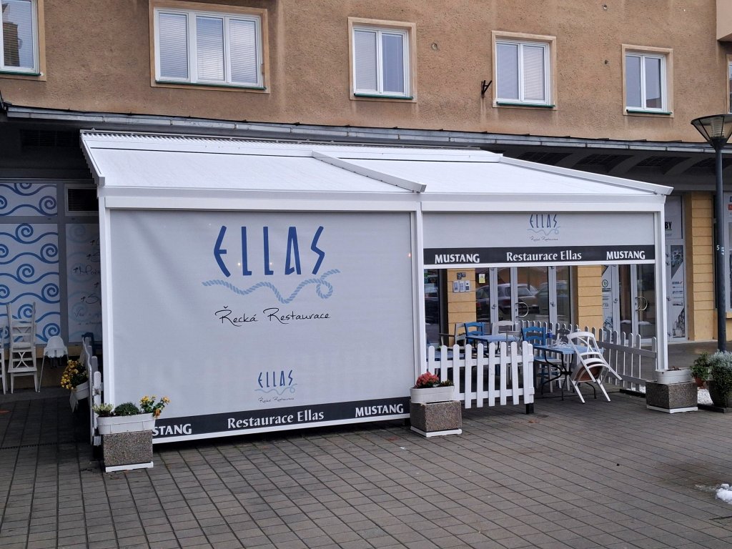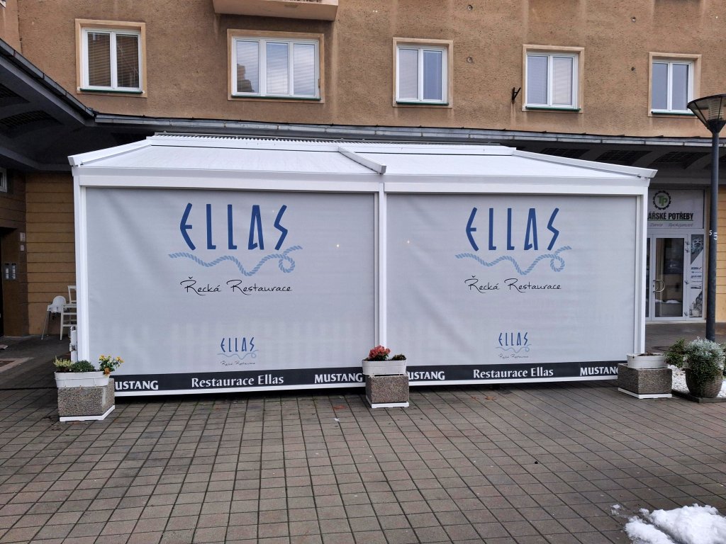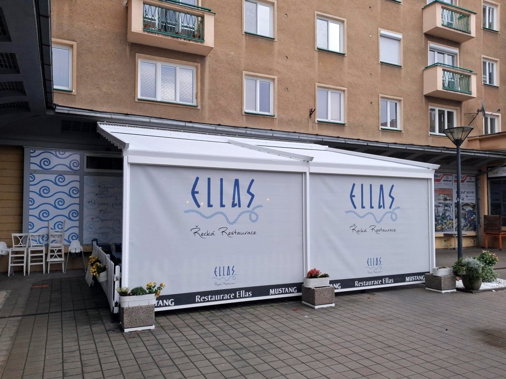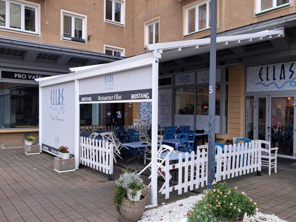 Kdo by nechtěl posedět venku a užívat si atmosféru i v chladnějších měsících? V Řecké restauraci Ellas v Ostravě-Porubě nyní mohou. S naším řešením se venkovní terasa proměnila v útulnou oázu, která prodlužuje letní sezónu na celoroční komfort. Lehká, ale pevná bílá konstrukce pergoly Linie s šedým PVC potahem evokuje středomořskou architekturu a zároveň poskytuje spolehlivou ochranu před deštěm i silným sluncem. Geniálním doplňkem jsou pak boční ZIP Screeny markýzy. Ty se pyšní nejen transparentní látkou s decentním potiskem loga restaurace, která nenarušuje výhled, ale především vytváří pocit soukromí a chrání hosty před nepříjemným větrem. Díky dálkovému ovládání je celá terasa připravena k použití stisknutím tlačítka. Z nevýrazného koutu se stalo místo plné elegance, kde si hosté mohou plnými doušky užívat řeckou kuchyni v příjemném prostředí.