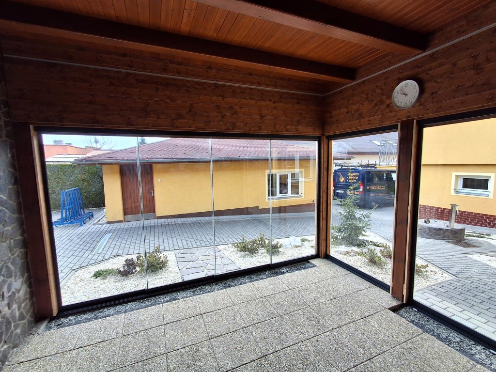 Máte pergolu, ale trápí vás vítr, prach nebo podzimní chlad? Tato realizace ukazuje efektivní řešení, jak proměnit otevřený přístřešek v plnohodnotnou zimní zahradu. Na stávající dřevěnou konstrukci jsme namontovali tři segmenty skleněných posuvných stěn s čirou výplní z 10 mm bezpečnostního skla. Celý systém je navržen pro maximální uživatelský komfort – od ručního ovládání, které zvládne každý, až po utopené kolejnice, o které nikdy nezakopnete. Realizace zahrnovala jak atypické fixní díly, tak široké čtyř kolejnicové posuvy, které umožňují pergolu v letních dnech téměř celou otevřít.