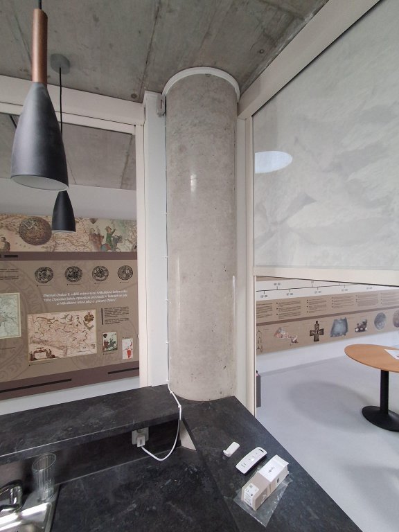 Realizace v opavském Müllerově domě ukazuje, že screenové rolety mají v moderní architektuře mnohem širší využití než jen ochranu před sluncem. Použili jsme svislé clony Screen ZIP jako elegantní dělící příčky s informační funkcí. Hlavním přínosem pro zákazníka je možnost plnobarevného potisku tkaniny, který v tomto případě nahrazuje pevné stěny a informuje návštěvníky o historii Opavského hradu. Díky preciznímu ZIP systému je látka v každé pozici dokonale napnutá, což je pro kvalitu zobrazeného tisku klíčové. Celý systém je integrován do čistého bílého interiéru a ovládán dálkově, což zajišťuje maximální komfort a funkčnost.