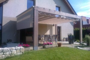 Nádherná dřevěná pergola si žádala krásné a funkční zastínění. Použili jsme systém Latin na střešní část a boční markýzu Sandra na bok.