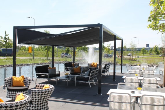 Cubola je velmi unikátní pergola. Je složena z pevné konstrukce, která může být volně v prostoru, ale i u zdi domu. Pergola je jedinečná možností naklápění látky na střeše, čímž zvládne zastínit i nízké sluneční paprsky. Pergola je vždy dodávaná s elektromotorem.