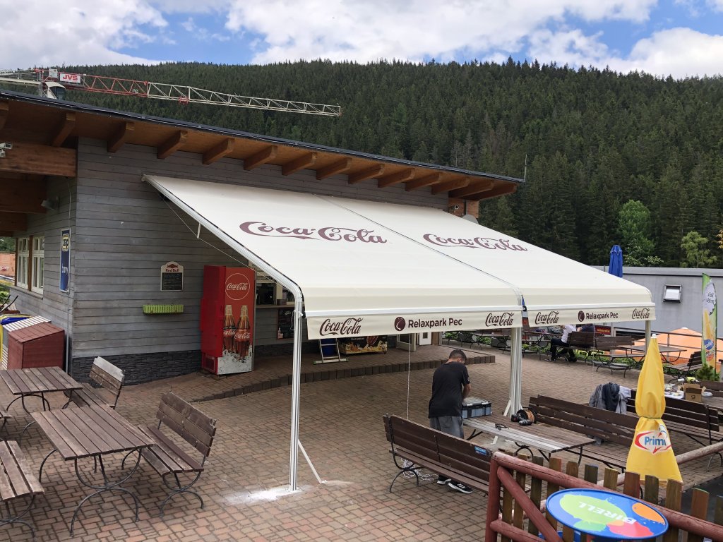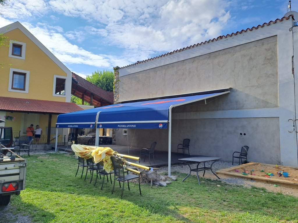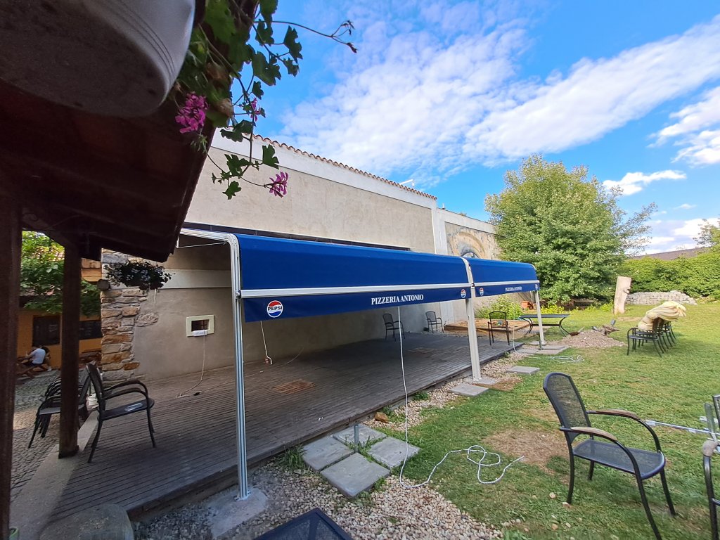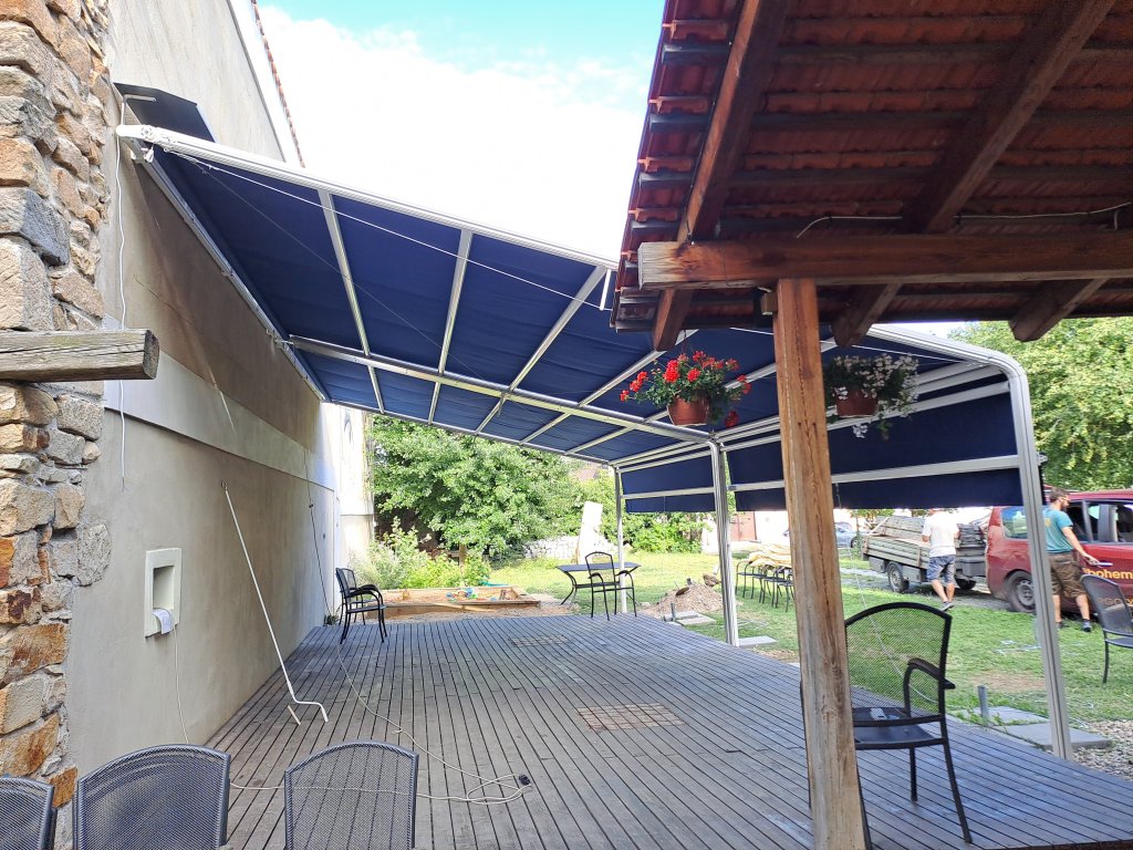 Markýza s hliníkovými vodicími kolejnicemi a stavitelnými oblouky zajišťuje stabilní vedení potahu a spolehlivý chod. Konstrukce je navržena pro pevnou montáž a dlouhou životnost i při každodenním používání.