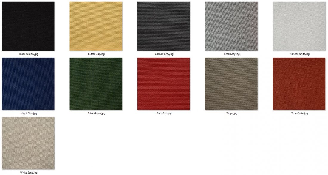 Potah je vyroben ze speciální akrylátové látky ošetřený nanotechnologií. Dosahuje tak výborných vlastností při ochraně před sluncem a mírným deštěm. Můžete si vybrat z 11 látek.