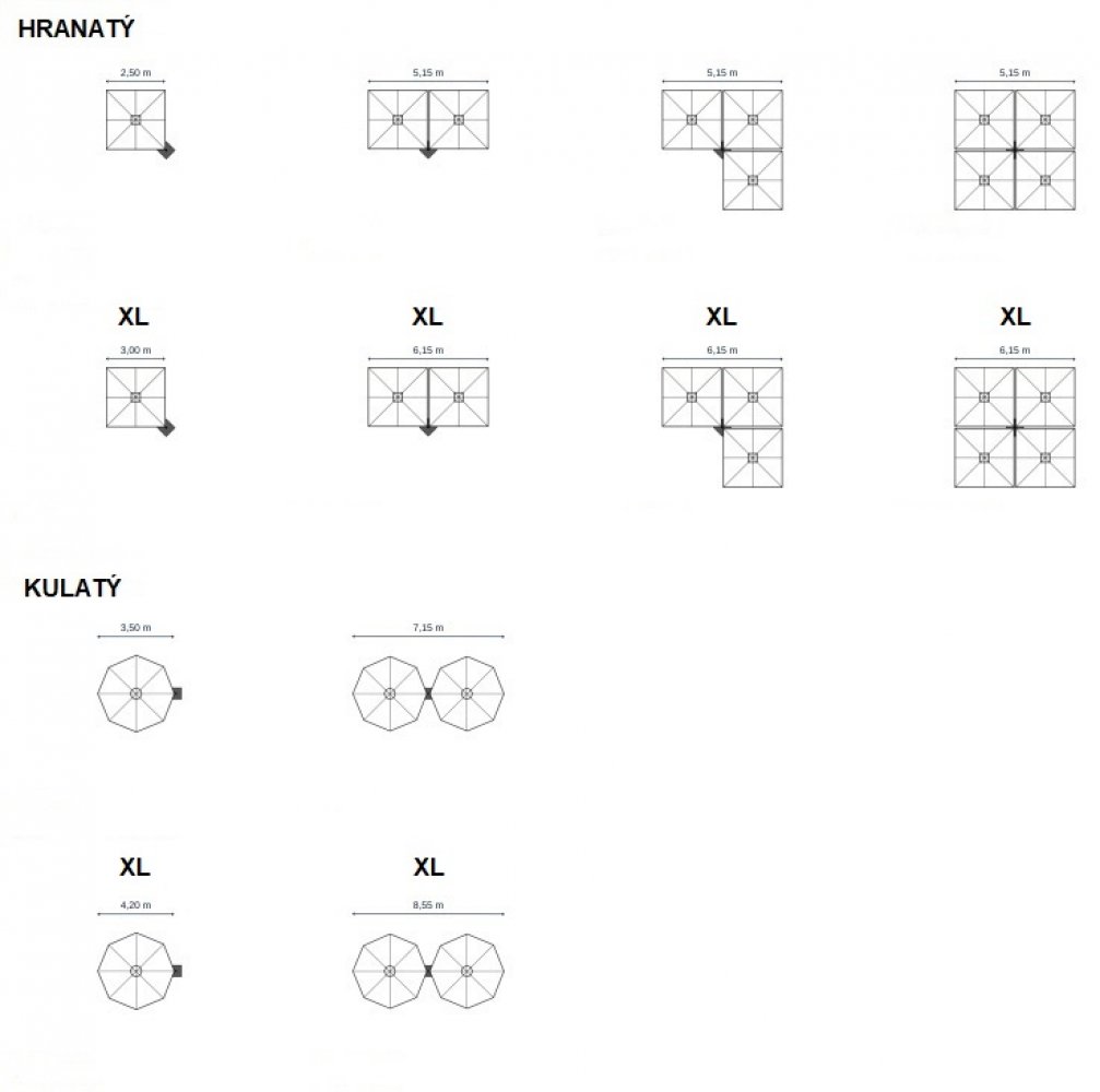 Několik variant konfigurací slunečníku umožňuje skutečně flexibilní použití. Kvalitní akrylové potahy od francouzského výrobce Dickson-Constant, které používáme i na markýzy, zajišťují stálobarevnost, ochranu proti UV záření a jsou také odolné vůči plísni.